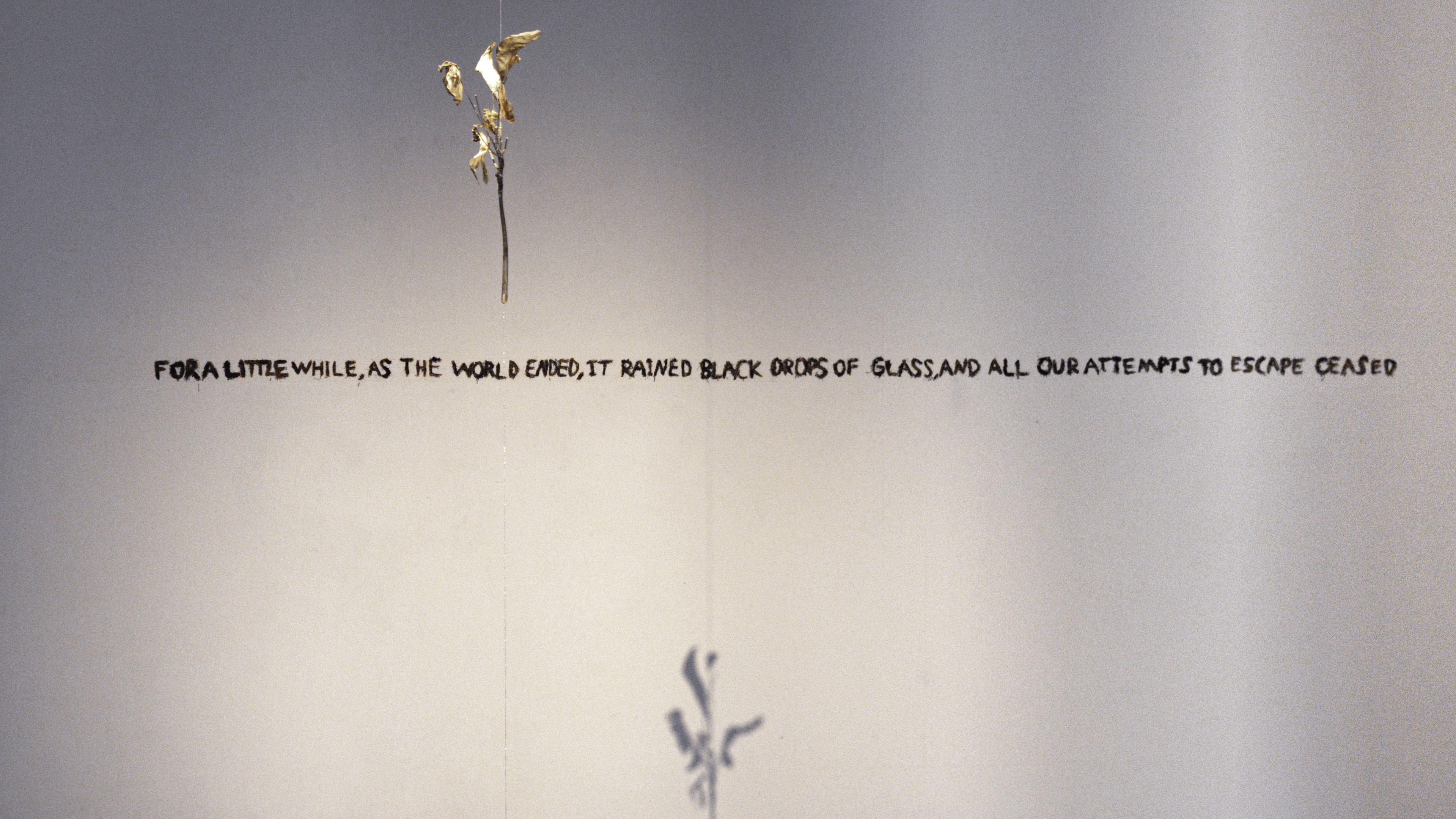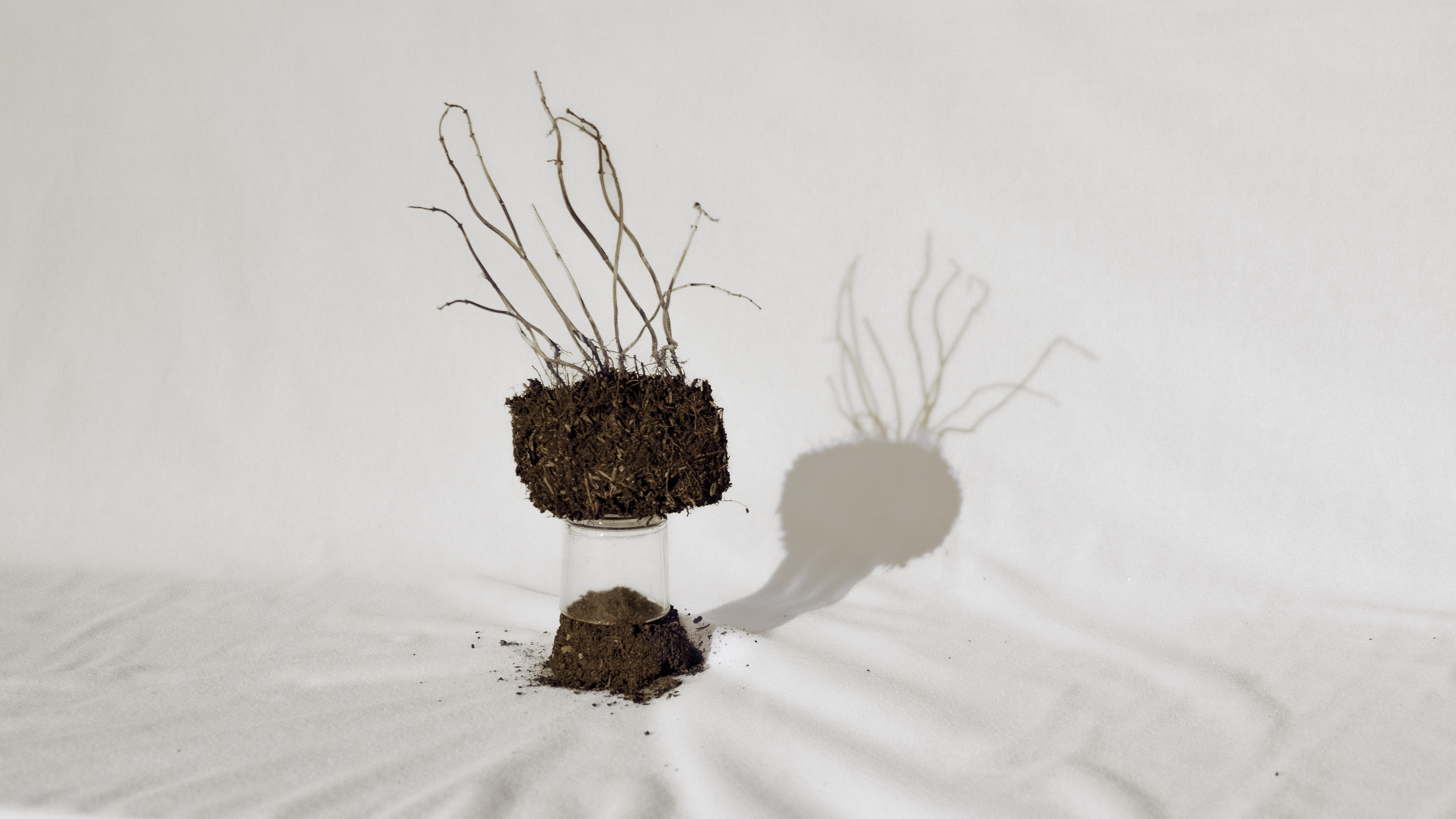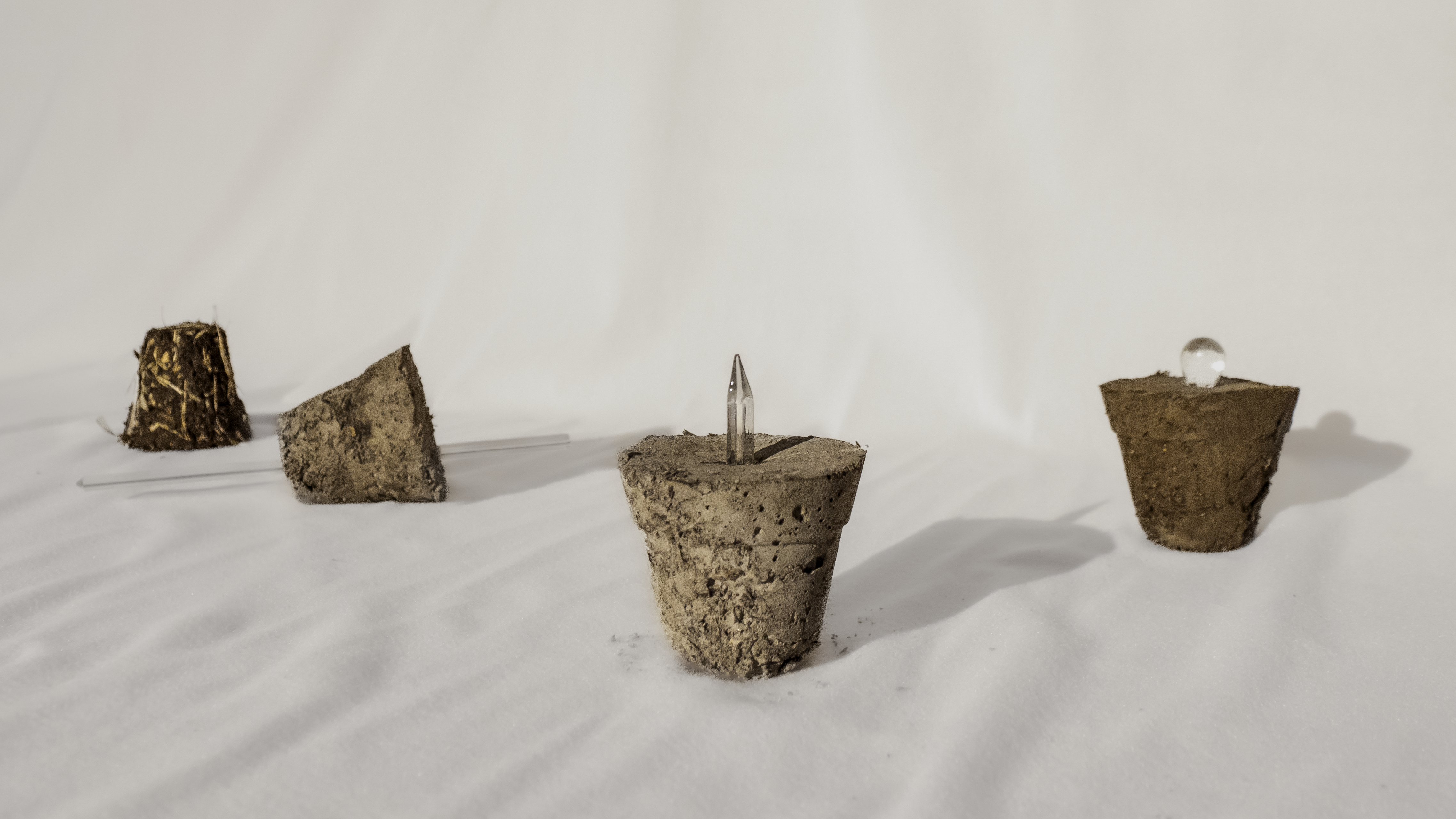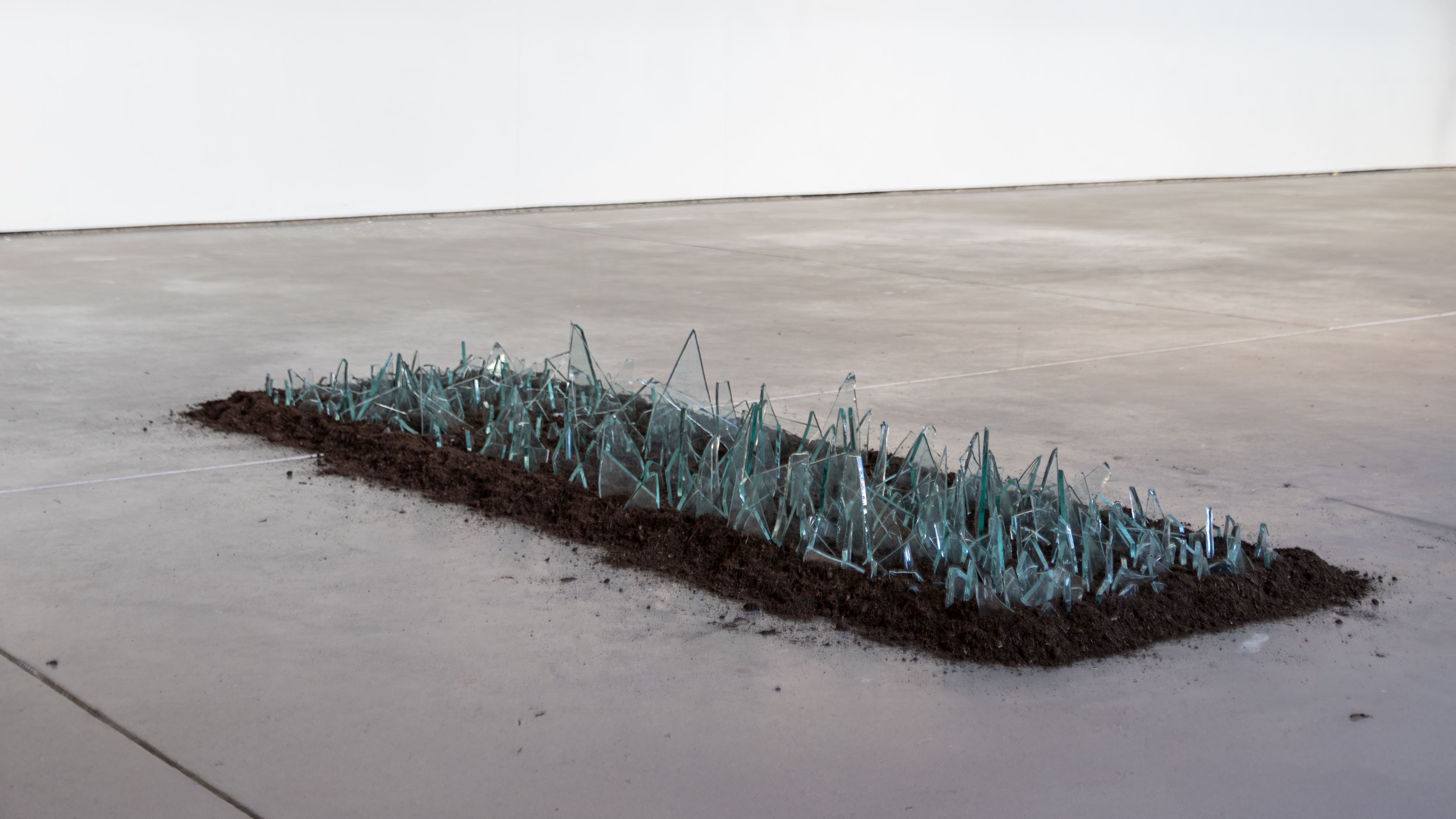 This work treats violence as a geological force, utilizing raw natural elements to map the physical strata of power and uprooting. In this fictional geology, catastrophe is rendered as a process of accumulation: soil is stripped of its stability and suspended as a looming, atmospheric pressure, while glass is divested of its transparency to become a violent sediment - a literal material deposit of shattered systems and inherited fear.