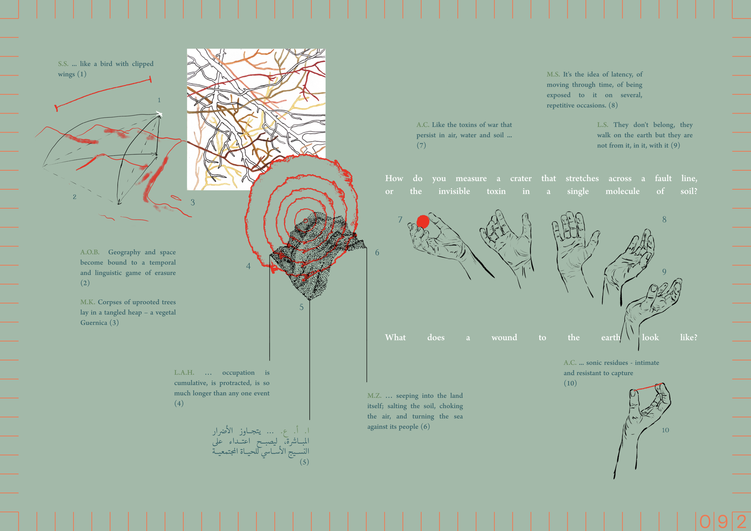 ︎Presented as an atlas of quotes and imagery drawn from the publication's contributions, Carla Aouad's 'Measures of Resistant Ecologies' is a visual meditation on the impact of war on human and ecological systems. Aouad's work explores the singular yet connected nature of ecological wounds. She poignantly asks, "What do the roots of a tree remember that the human mind has forgotten?". Her work emphasizes the premise of this publication, the interdependence of human and more-than-human survival.